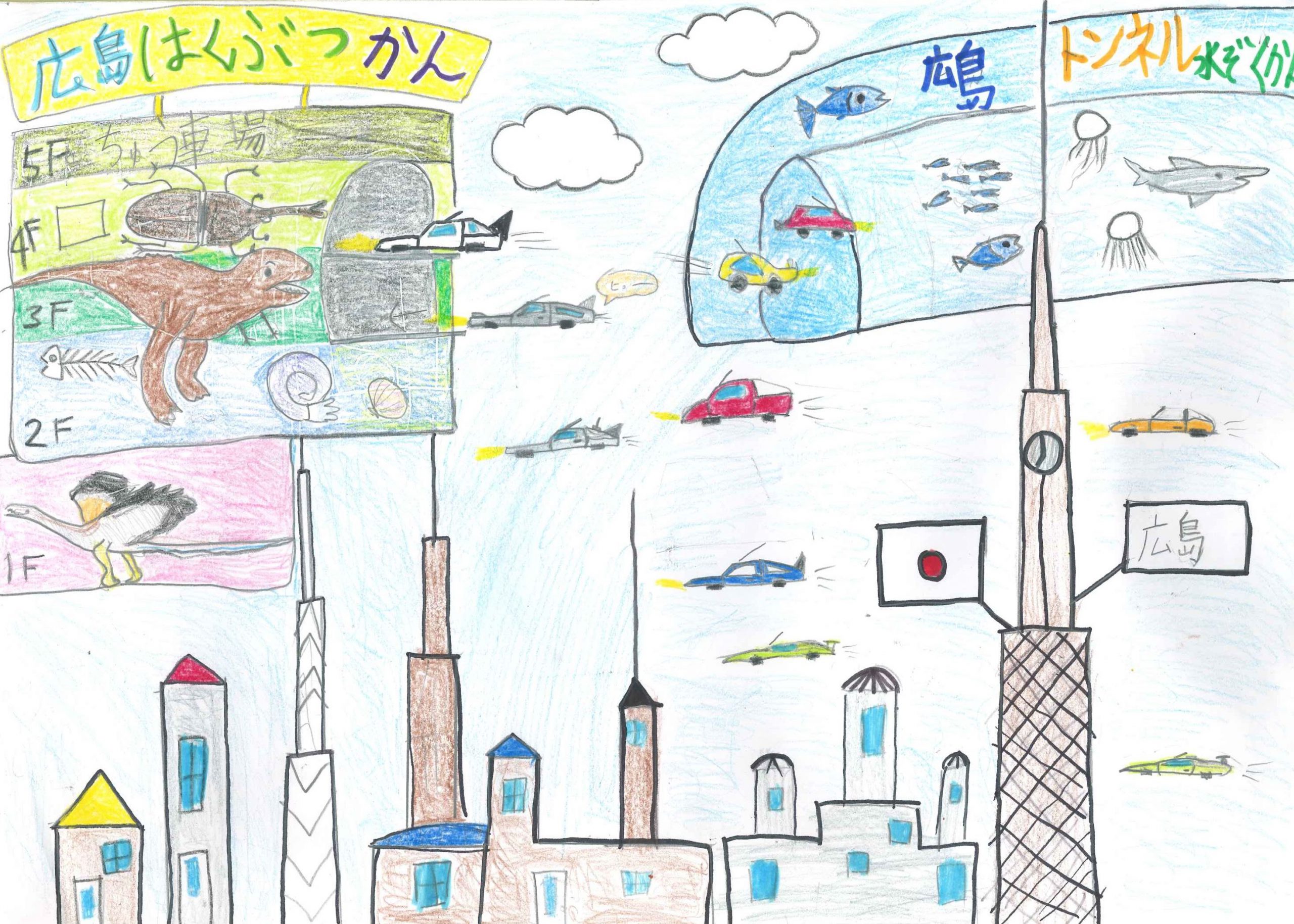 空とぶ車と広島水ぞくかん 広島大学附属小学校 2年 平尾 理希 みらいのひろしまのまちは、そらとぶ車でどこでもいけて、下には、すごくながいとけいだいがあります。水ぞくかんもはくぶつかんもじゅうたいなし!「みつ」にもならないよ!