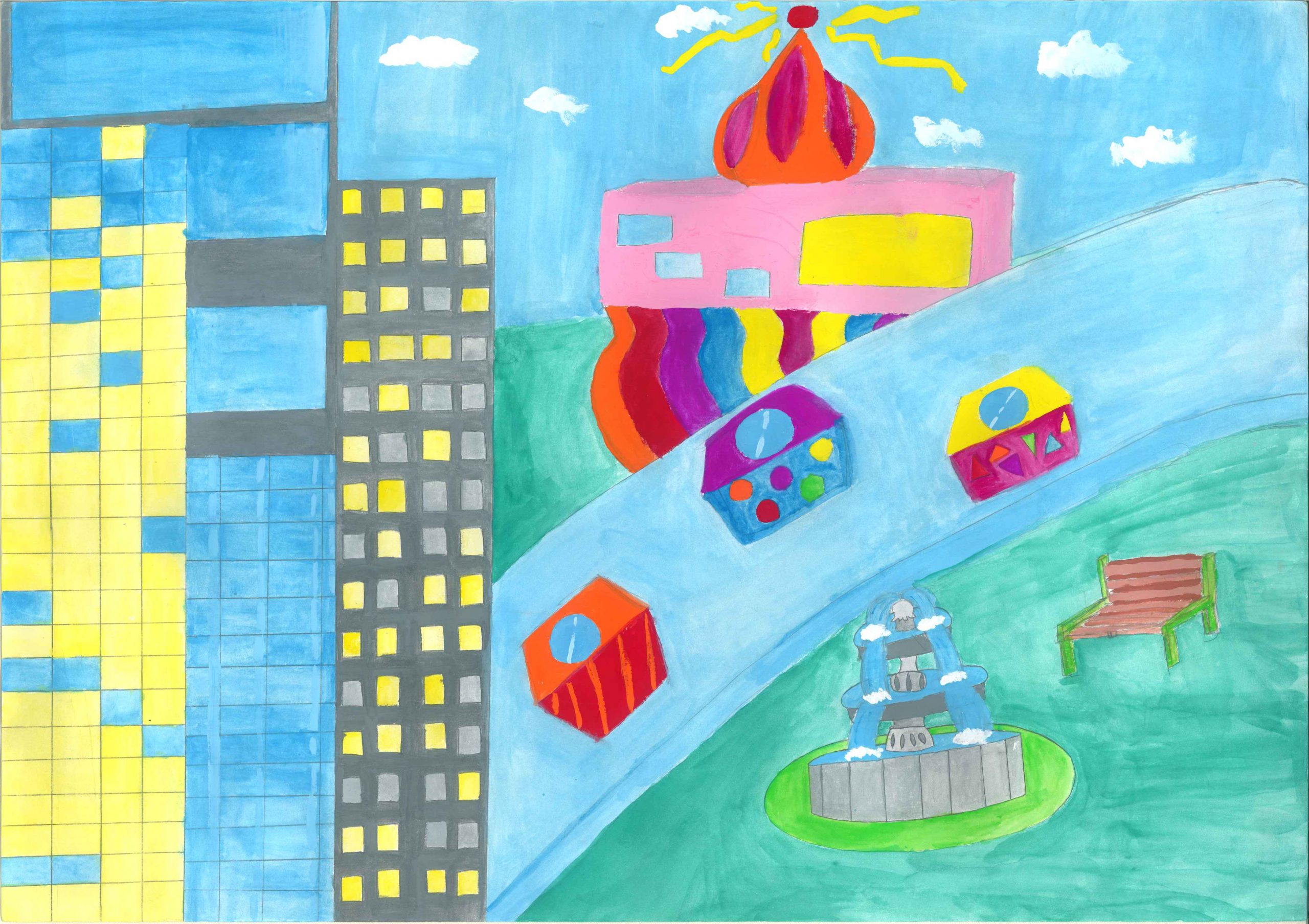 五日市中学校 2年 伊藤 詩乃 「カラフルで明るくスマイルいっぱいな町」この作品はシャボン玉にあわして未来の町の様子をかきました。海や夕焼けが美しく、今の時代にありえないことなどをつめこんだ作品です。自由な発想でと書いてあったので本当に自由に作品をかき、カラフルと明るさを強調した作品です。そして、ポスターカラーだけど水彩絵の具のような透明感をつくるのを工夫しました。カラフルで明るくスマイルいっぱいの町、こんな未来はぜったい楽しいと思います!