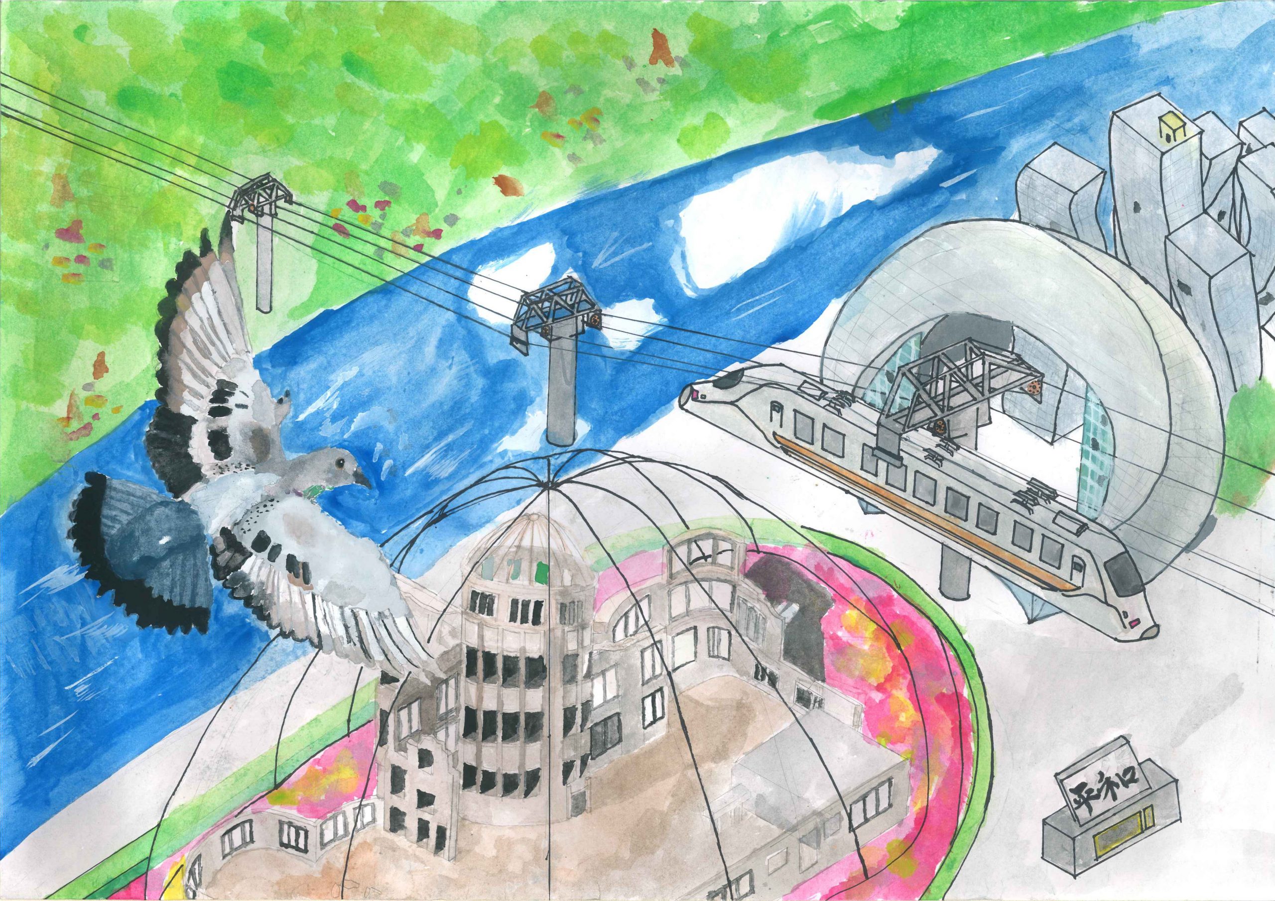 技術と自然が共存する平和の街広島 五月が丘中学校 1年 木村 哉仁 消えてはならない原爆ドームはとうめいとドームに包まれ電車は空を走りビルはねじらせて未来感出した。でも川をまたげば自然が溢れていて未来をイメージした