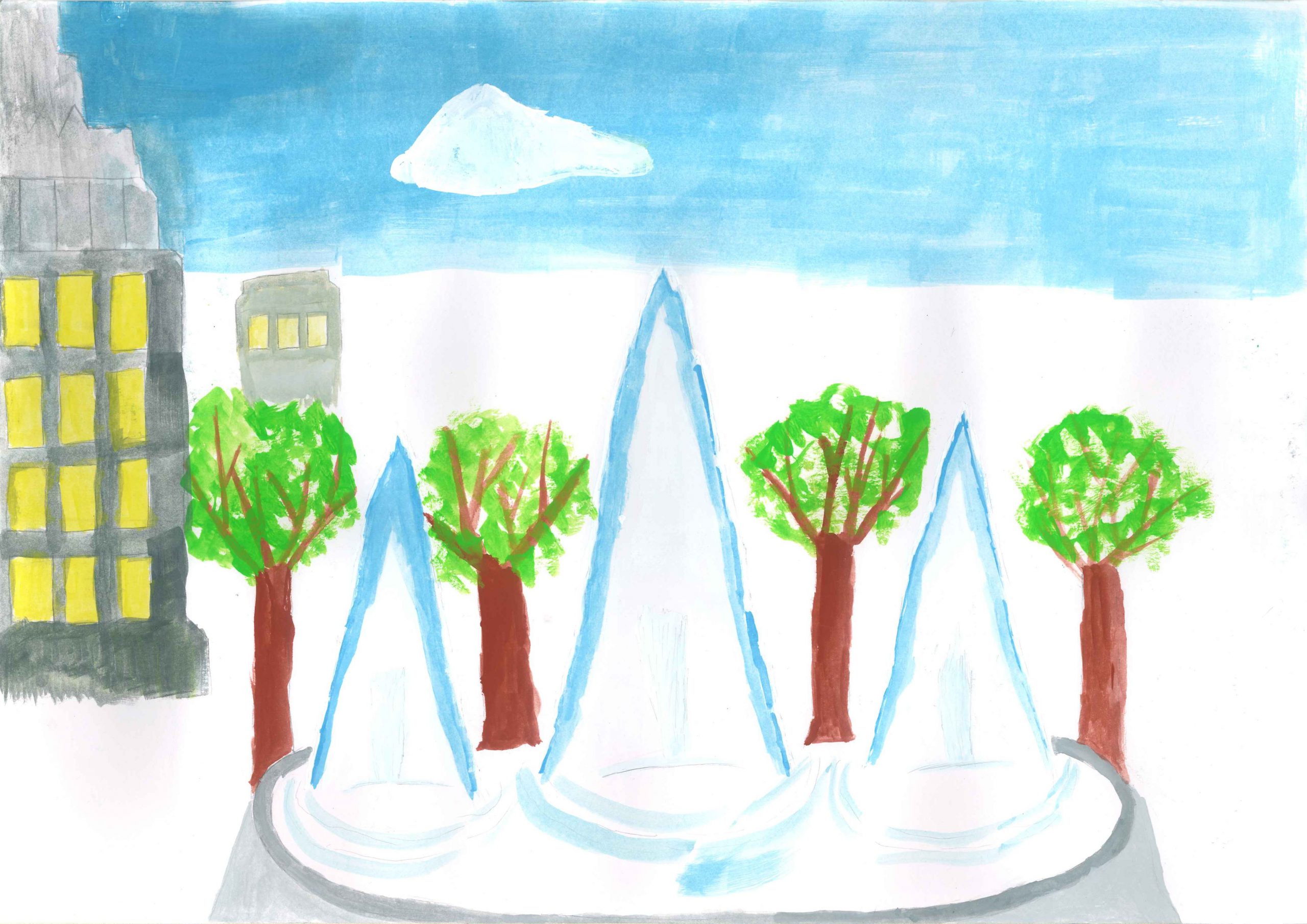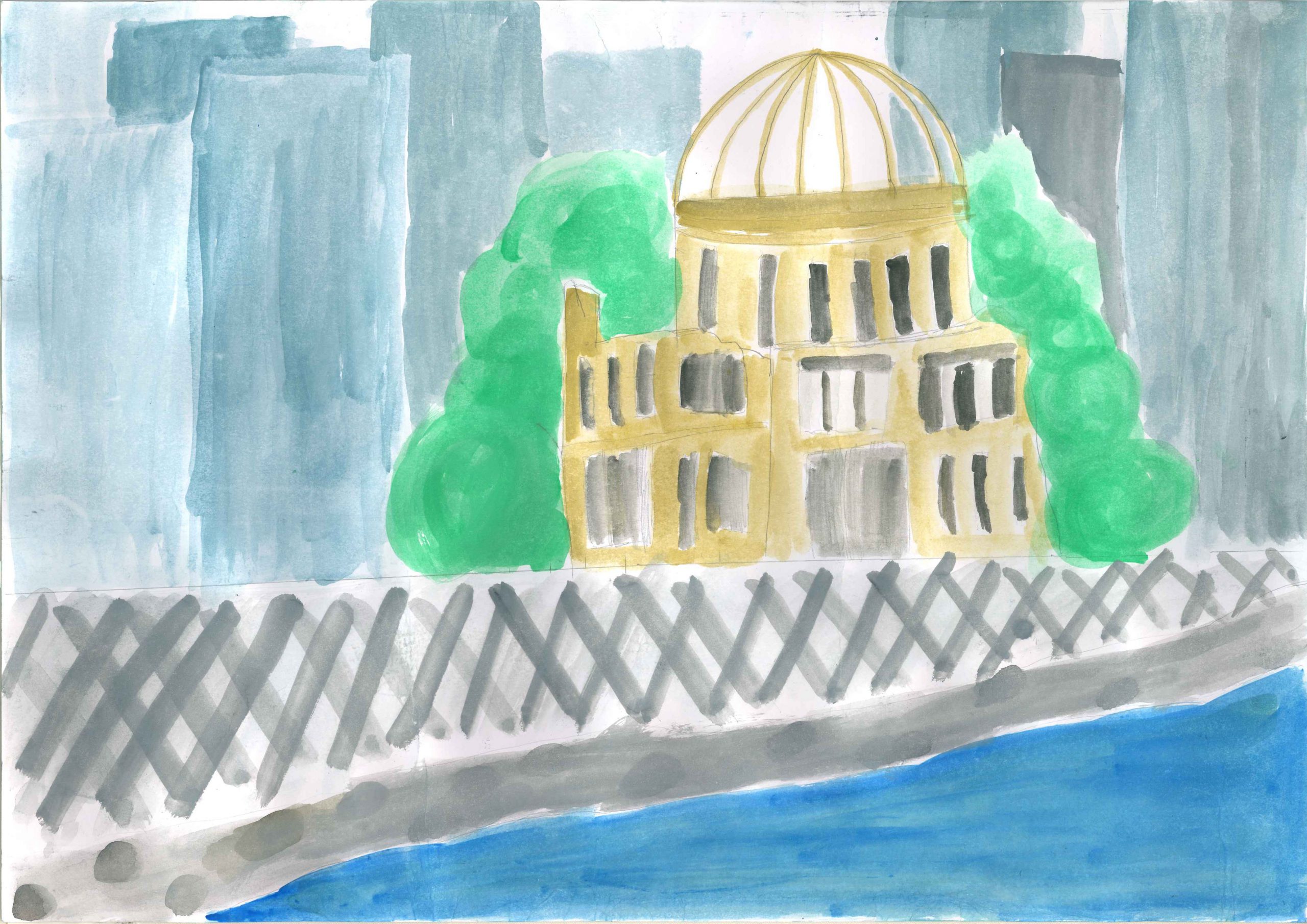 平和記念都市であり続ける広島 五月が丘中学校 3年 宮本 香苑 川の上に橋を建てて被爆電車を走らせました。原爆ドームや折り鶴タワーを描きました。未来っぽい建物を建てました。ほぼ今と変わらないということを描きました。