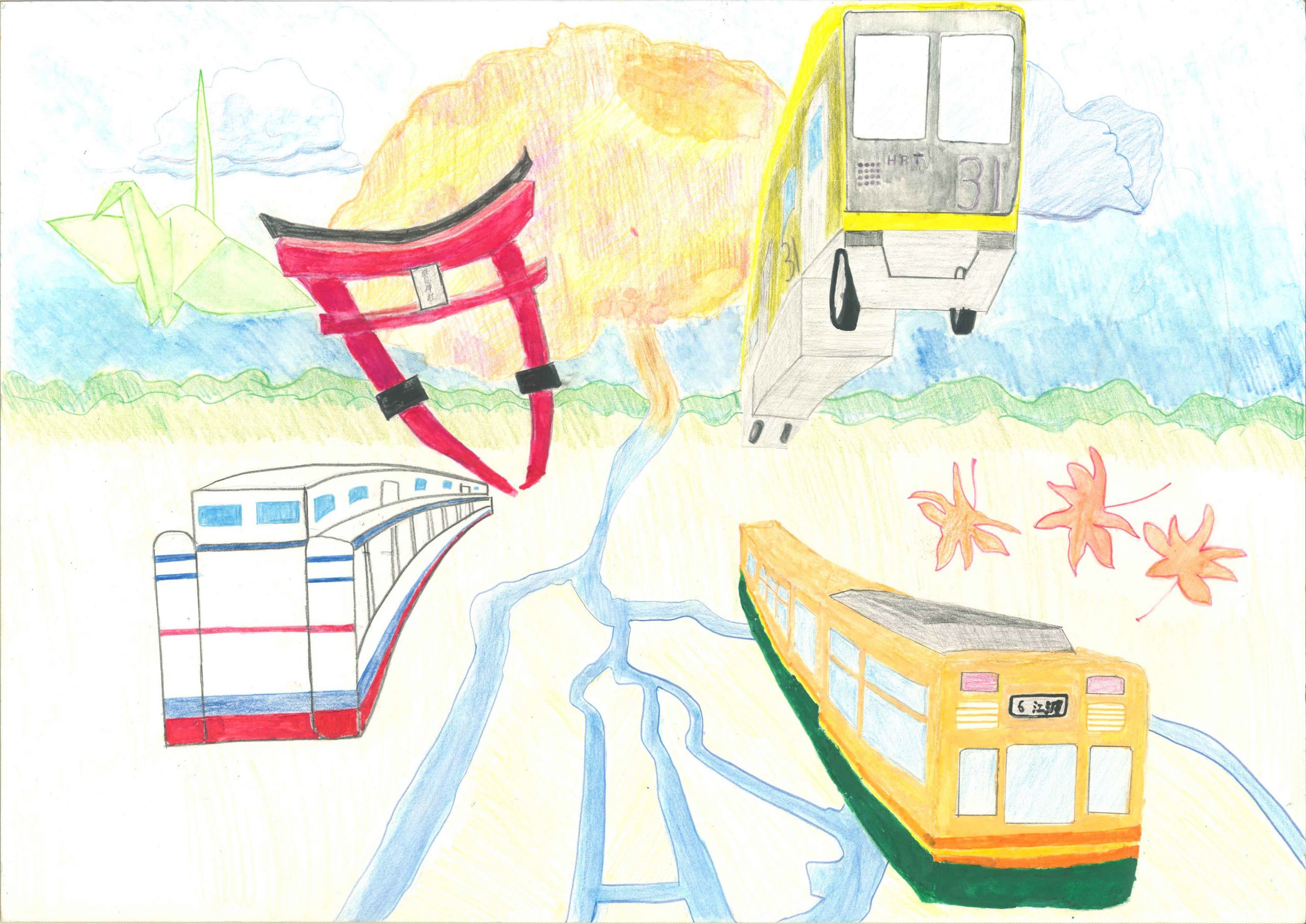 緑豊かな広島 舟入高等学校 1年 間口 真衣 全国でもめずらしい市電はこれからも受けつぎたいと思い、市電をかきました。平和の象徴である「緑」は、もっと広島にふやすべきだと思います。これからも広島が平和であるように、このような絵をかきました。