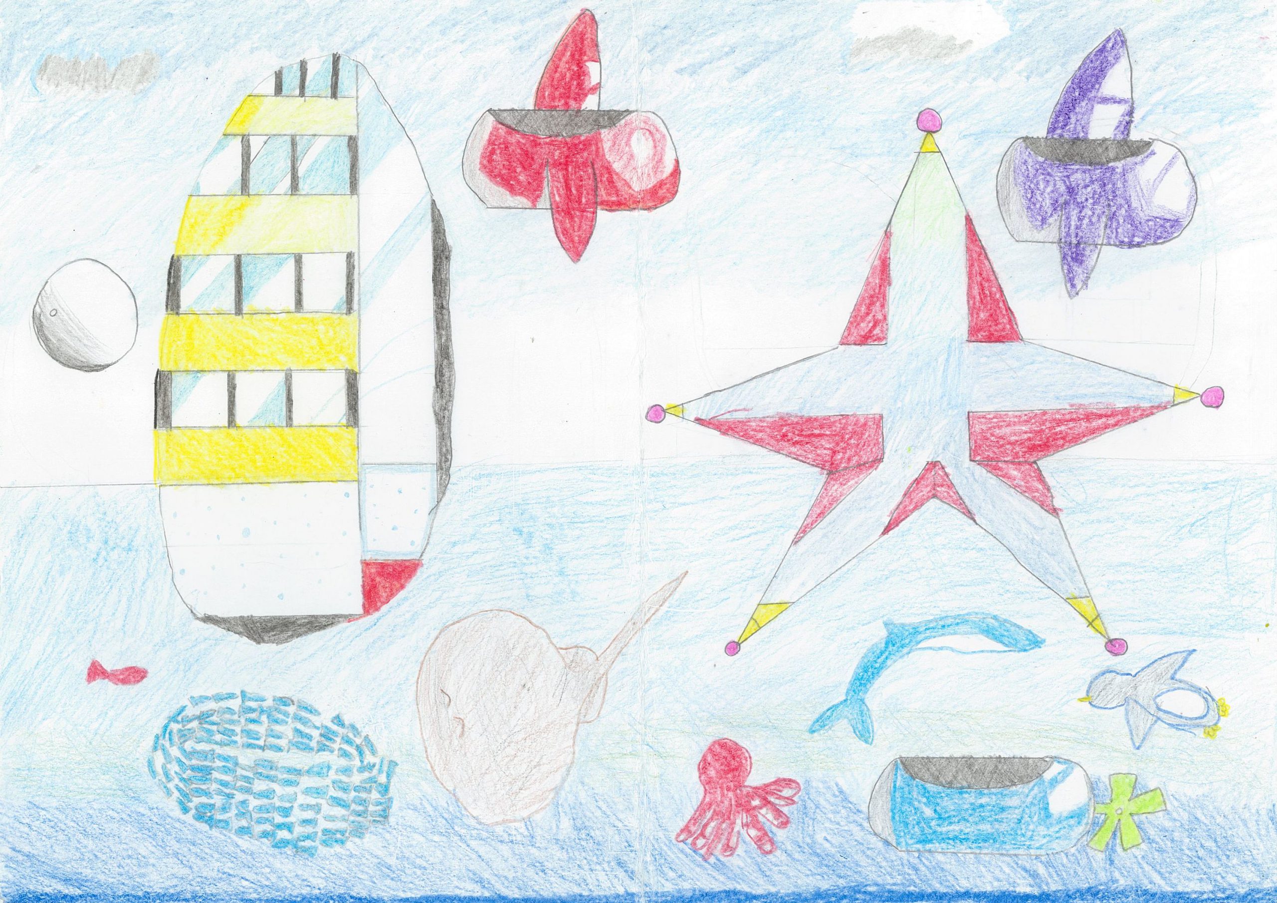 未来のきれいな町 己斐上小学校 3年 岡西 亜蓮 くるまは早く走るために後ろにジェットエンジンをつけ早く走れる車にしました。家は引っ越しするときに飛んで早く引っ越しできるようにしました。ホテルはきれいにするためにキラキラ輝く金にしました。